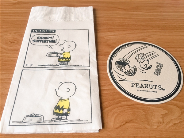 ピナツカフェのナプキン(無料) | こんなにかわいい柄使えないです。 もちろん未使用のまま持って帰ってきました。 コースターはレモネードを頼むと C.B.、ライナス、ルーシーから選ばせてもらえます。 |